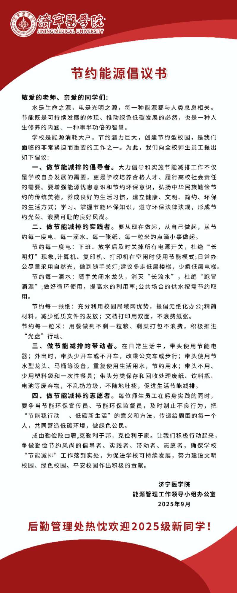 日常管理中,在照明开关、水龙头等关键位置张贴“随手关灯”、“节约用水”等醒目标识,时刻提醒师生养成节能习惯。每逢开学季,通过悬挂节能主题横幅、发布生活指南等方式,广泛动员全校师生共同践行绿色低碳理念,营造了共建共享绿色校园的浓厚氛围。